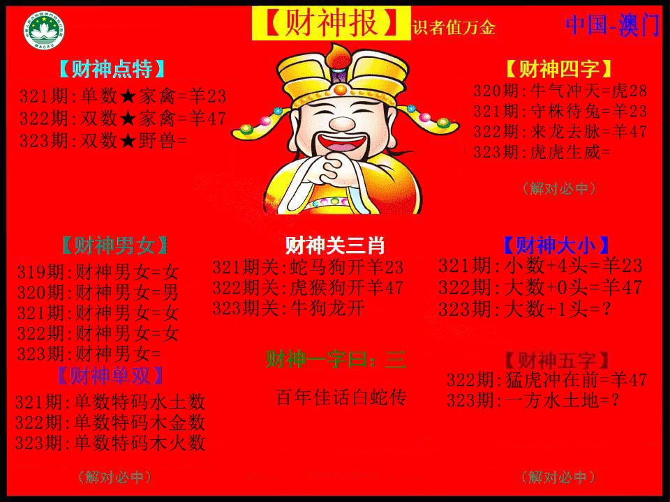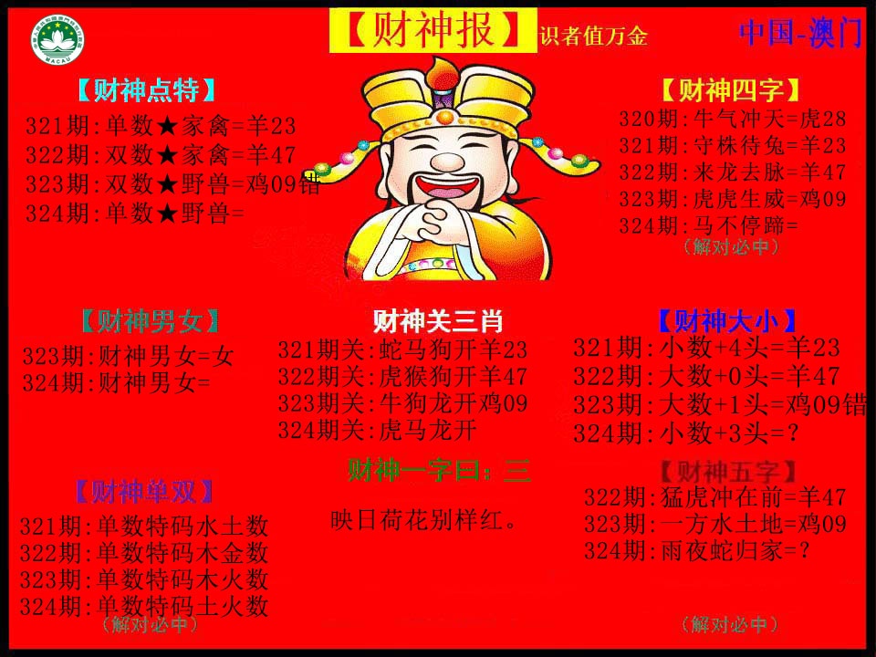 | 322期: 买啥都中 【家肖家肖家肖】开:羊47准 |